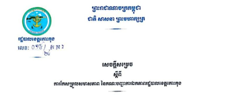 សេចក្តីសម្រេច ស្តីពីការកែសម្រួលសមាសភាព នៃគណៈបញ្ជាការឯកភាពរដ្ឋបាលខេត្តកោះកុង