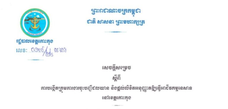 សេចក្តីសម្រេច ស្តីពីការបង្កើតក្រុមការងារចុះបញ្ជីជលយាន និងផ្តល់លិខិតអនុញ្ញាតឱ្យធ្វើអាជីវកម្មនេសាទ នៅខេត្តកោះកុង