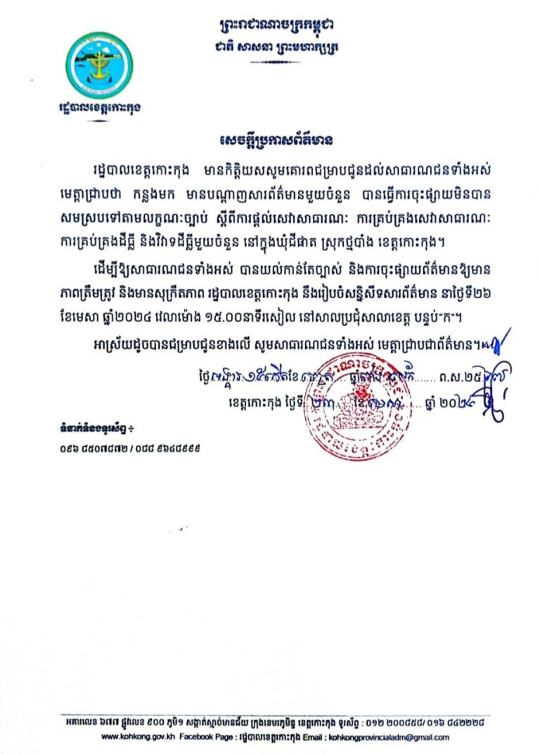សេចក្តីប្រកាសព័ត៌មាន របស់រដ្ឋបាលខេត្តកោះកុង ស្តីពីការផ្តល់សេវាសាធារណៈ ការគ្រប់គ្រងសេវាសាធារណៈ ការគ្រប់គ្រងដីធ្លី និងវិវាទដីធ្លីមួយចំនួន នៅក្នុងឃុំជីផាត ស្រុកថ្មបាំង ខេត្តកោះកុង