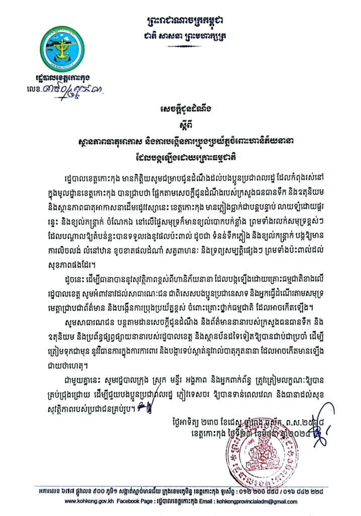សេចក្តីជូនដំណឹង ស្តីពីស្ថានភាពធាតុអាកាស និងការបង្កើនការប្រុងប្រយ័ត្នចំពោះហានិភ័យនានា ដែលបង្កឡើងដោយគ្រោះធម្មជាតិ