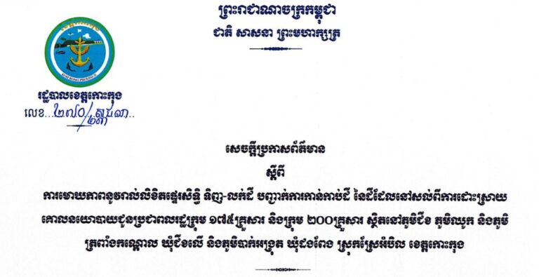 សេចក្តីប្រកាសព័ត៌មាន ស្តីពីការមោឃភាពនូវរាល់លិខិតផ្ទេរសិទ្ធិ ទិញ-លក់ដី បញ្ជាក់ការកាន់កាប់ដី នៃដីដែលនៅសល់ពីការដោះស្រាយ គោលនយោបាយ ជូនប្រជាពលរដ្ឋក្រុម ១៧៥គ្រួសារ និងក្រុម ២០០គ្រួសារ ស្ថិតនៅភូមិជីខ ភូមិឈូក និងភូមិត្រពាំងកណ្ដោល ឃុំជីខលើ និងភូមិបាក់អង្រុត ឃុំដងពែង ស្រុកស្រែអំបិល ខេត្តកោះកុង