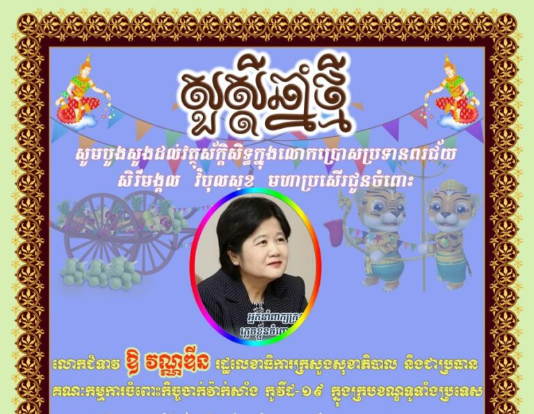 សារលិខិតគោរពជូនពរ លោកជំទាវ ឱ វណ្ណឌីន រដ្ឋលេខាធិការក្រសួងសុខាភិបាល ក្នុងឱកាសពិធីបុណ្យចូលឆ្នាំប្រពៃណីជាតិខ្មែរ គោរពជូនពរពី ឯកឧត្ដមវេជ្ជបណ្ឌិត ទៅ ម៉ឹង ប្រធានមន្ទីរសុខាភិបាលនៃរដ្ឋបាលខេត្តកោះកុង