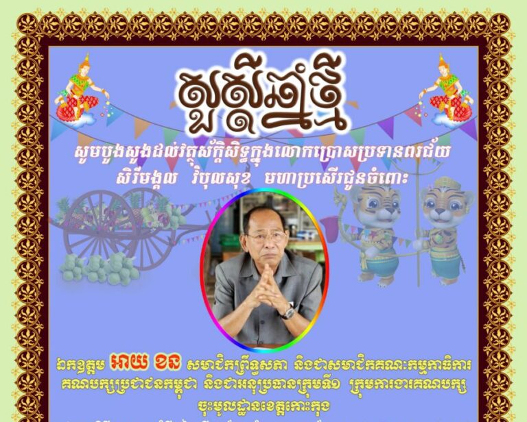 សារលិខិតគោរពជូនពរ ឯកឧត្ដម អាយ ខន សមាជិកព្រឹទ្ធសភា ក្នុងឱកាសពិធីបុណ្យចូលឆ្នាំប្រពៃណីជាតិខ្មែរ គោរពជូនពរពី ឯកឧត្ដមវេជ្ជបណ្ឌិត ទៅ ម៉ឹង ប្រធានមន្ទីរសុខាភិបាលនៃរដ្ឋបាលខេត្តកោះកុង
