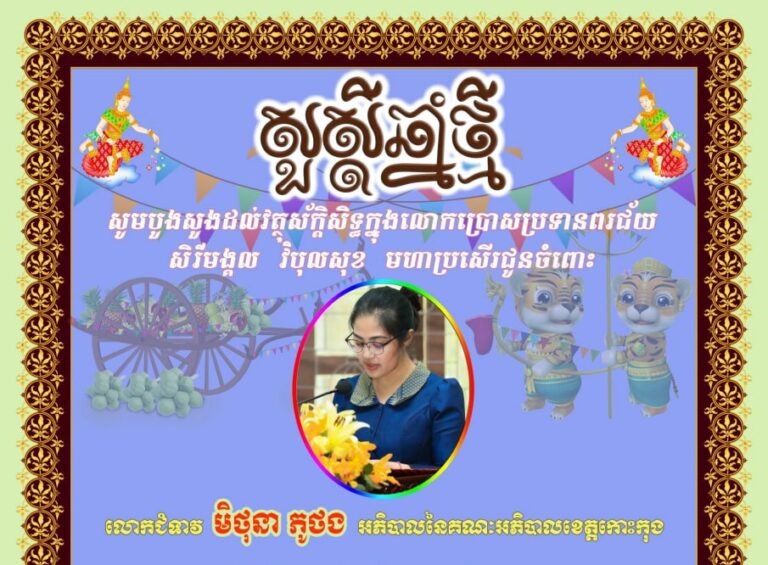 សារលិខិតគោរពជូនពរ លោកជំទាវ មិថុនា ភូថង អភិបាលនៃគណៈអភិបាលខេត្តកោះកុង ក្នុងឱកាសពិធីបុណ្យចូលឆ្នាំប្រពៃណីជាតិខ្មែរ គោរពជូនពរពី ឯកឧត្ដមវេជ្ជបណ្ឌិត ទៅ ម៉ឹង ប្រធានមន្ទីរសុខាភិបាលនៃរដ្ឋបាលខេត្តកោះកុង