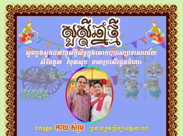 សារលិខិតគោរពជូនពរ ឯកឧត្ដម កាយ សំរួម ប្រធានក្រុមប្រឹក្សាខេត្តកោះកុង ក្នុងឱកាសពិធីបុណ្យចូលឆ្នាំប្រពៃណីជាតិខ្មែរ គោរពជូនពរពី ឯកឧត្ដមវេជ្ជបណ្ឌិត ទៅ ម៉ឹង ប្រធានមន្ទីរសុខាភិបាលនៃរដ្ឋបាលខេត្តកោះកុង
