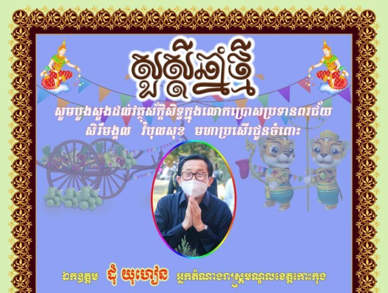 សារលិខិតគោរពជូនពរ ឯកឧត្ដម ដុំ យុហៀន តំណាងរាស្រ្តមណ្ឌលខេត្តកោះកុង ក្នុងឱកាសពិធីបុណ្យចូលឆ្នាំប្រពៃណីជាតិខ្មែរ គោរពជូនពរពី ឯកឧត្ដមវេជ្ជបណ្ឌិត ទៅ ម៉ឹង ប្រធានមន្ទីរសុខាភិបាលនៃរដ្ឋបាលខេត្តកោះកុង