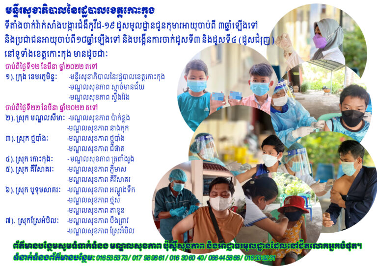 ចាក់វ៉ាក់សាំងបង្ការជំងឺកូវីដ-១៩ ដូសមូលដ្ឋានជូនកុមារអាយុចាប់ពី ៣ឆ្នាំឡើងទៅ និងប្រជាពលរដ្ឋអាយុចាប់ពី១៨ឆ្នាំឡើងទៅ និងបង្កើនការចាក់ដូសទី៣ និងដូសទី៤ (ដូសជំរុញ) នៅទូទាំងខេត្តកោះកុង