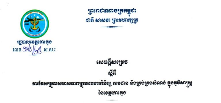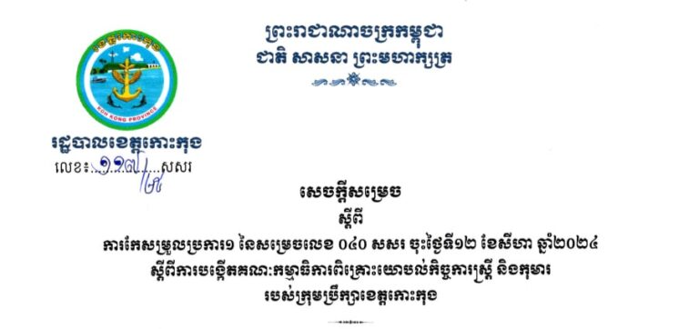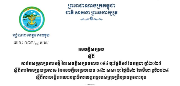 សេចក្តីសម្រេច ស្តីពីការកែសម្រួលសមាសភាពក្រុមការងារពិនិត្យ តាមដាន និងគ្រប់គ្រងសំណង់ ក្នុងភូមិសាស្ត្រ នៃខេត្តកោះកុង