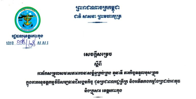 សេចក្តីសម្រេច ស្តីពីការកែសម្រួលសមាសភាពគណៈកម្មាធិការគ្រប់គ្រងគ្រោះមហន្តរាយខេត្តកោះកុង