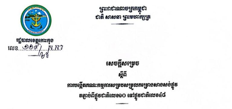 សេចក្តីសម្រេច ស្តីពីការបង្កើតគណៈកម្មការសម្របសម្រួលគម្រោងសាងសង់ផ្លូវ តភ្ជាប់ពីផ្លូវជាតិលេខ១០ ទៅផ្លូវជាតិលេខ៤៨