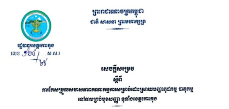 សេចក្តីសម្រេច ស្តីពីការកែសម្រួលសមាសភាពគណៈកម្មការសម្រាប់ដោះស្រាយបញ្ហាកូដកម្ម បាតុកម្ម គ្រប់មុខសញ្ញា ទូទាំងខេត្តកោះកុង