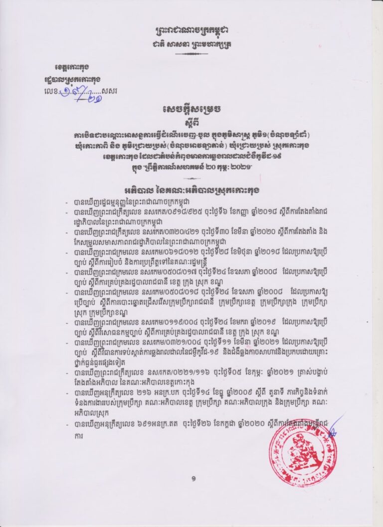 សេចក្តីសម្រេច ស្តីពី ការបិទជាបណ្តោះអាសន្នការធ្វើដំណើរចេញ-ចូល ក្នុងភូមិសាស្ត្រ ភូមិ១(ចំណុចឡាំដាំ) ឃុំកោះកាពិ និងភូមិជ្រោយប្រស់(ចំណុចអាវឡាតាន់) ឃុំជ្រោយប្រស់ ស្រុកកោះកុង ខេត្តកោះកុង ដែលជាតំបន់កំពុងមានការឆ្លងរាលដាលជំងឺកូវីដ-១៩ ក្នុងព្រឹត្តិការណ៍សហគមន៍ ២០កុម្ភៈ ២០២១