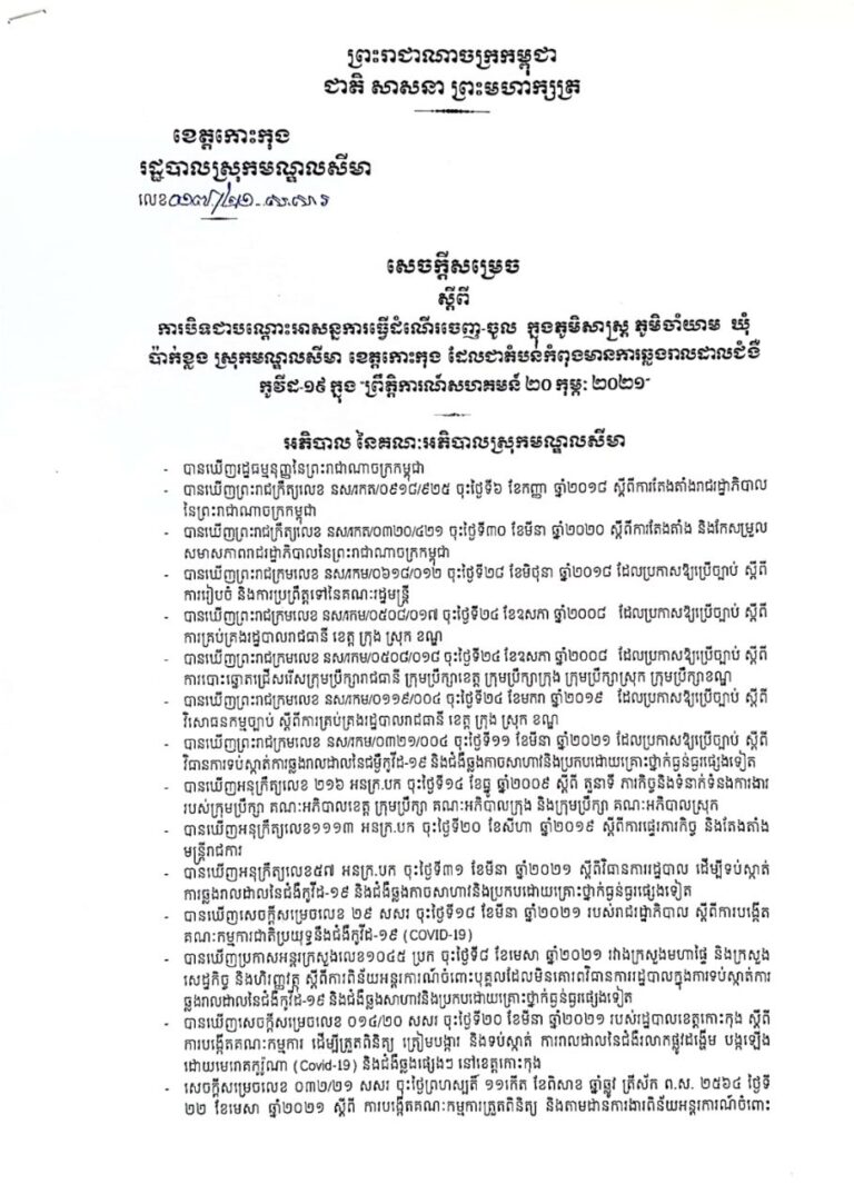 សេចក្តីសម្រេច ស្តីពីការបិទជាបណ្តោះអាសន្នការធ្វើដំណើរចេញ-ចូល ក្នុងភូមិសាស្ដ្រ ឃុំស្រែអំបិល ឃុំជ្រោយស្វាយ និងឃុំបឹងព្រាវ ស្រុកស្រែអំបិល ខេត្តកោះកុង ដែលជាតំបន់កំពុង មានការឆ្លងរាលដាលជំងឺកូវីដ-១៩ ក្នុង “ព្រឹត្តិការណ៍សហគមន៍ ២០ កុម្ភៈ ២០២១