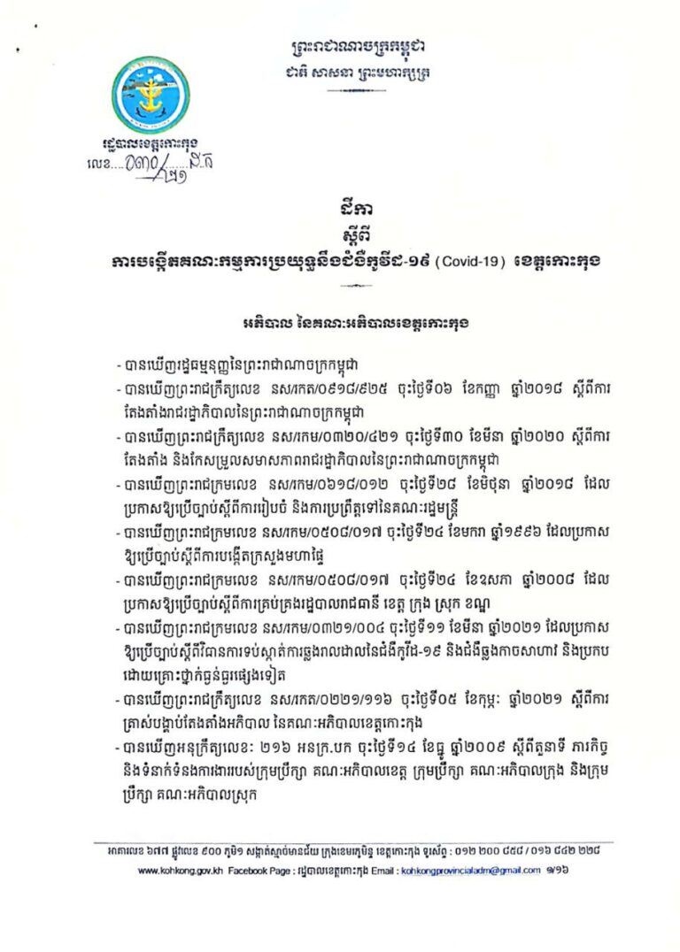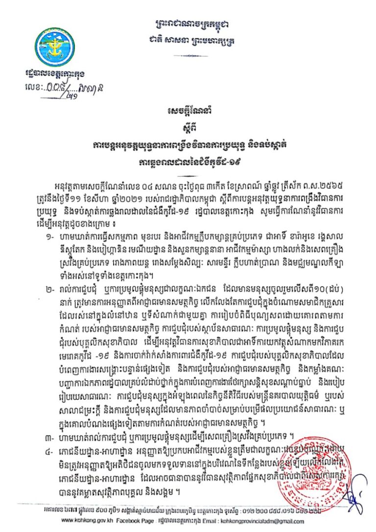 សេចក្តីសម្រេច ស្តីពីការបិទខ្ទប់ភូមិសាស្ត្រខេត្តកោះកុងរយៈពេល ១៤(ដប់បួន)ថ្ងៃ ដោយគិតចាប់ពីថ្ងៃទី២៩ ខែកក្កដា ឆ្នាំ២០២១ រហូតដល់ថ្ងៃទី១២ ខែសីហា ឆ្នាំ២០២១ ដើម្បីទប់ស្កាត់ការឆ្លងរាលដាលក្នុងសហគមន៍ ដែលបណ្តាលមកពីមេរោគកូវីដ-១៩ ប្រភេទ ដែលតា(Delta)
