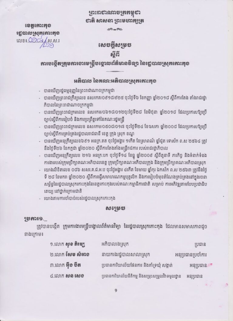 សេចក្តីសម្រេចលេខ០១៨/២១ ស.ស.រ ស្តីពី ការបង្កើតក្រុមការងារមន្តី្របង្គោលព័ត៌មានវិទ្យា នៃរដ្ឋបាលស្រុកកោះកុង ខេត្តកោះកុង