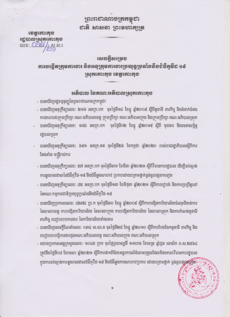 សេចក្តីសម្រេចលេខ០១៧/២១ ស.ស.រ ស្តីពី ការបង្កើតក្រុមការងារ និងអនុក្រុមការងារប្រយុទ្ធប្រឆាំងនឹងជំងឺកូវីដ-១៩ ស្រុកកោះកុង ខេត្តកោះកុង
