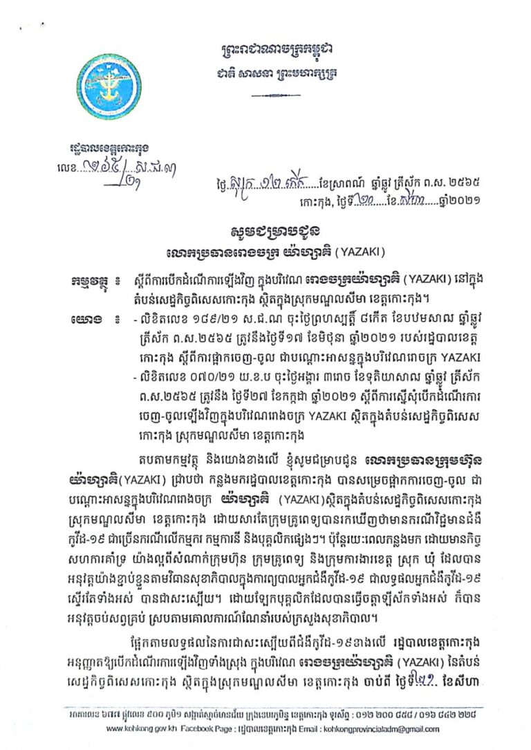 សេចក្តីជូនដំណឹង ស្តីពីការបើកដំណើរការឡើងវិញ ក្នុងបរិវេណ រោងចក្រយ៉ាហ្សាគិ(YAZAKI) នៅក្នុងតំបន់សេដ្ឋកិច្ចពិសេសកោះកុង ស្ថិតក្នុងស្រុកមណ្ឌលសីមា ខេត្តកោះកុង