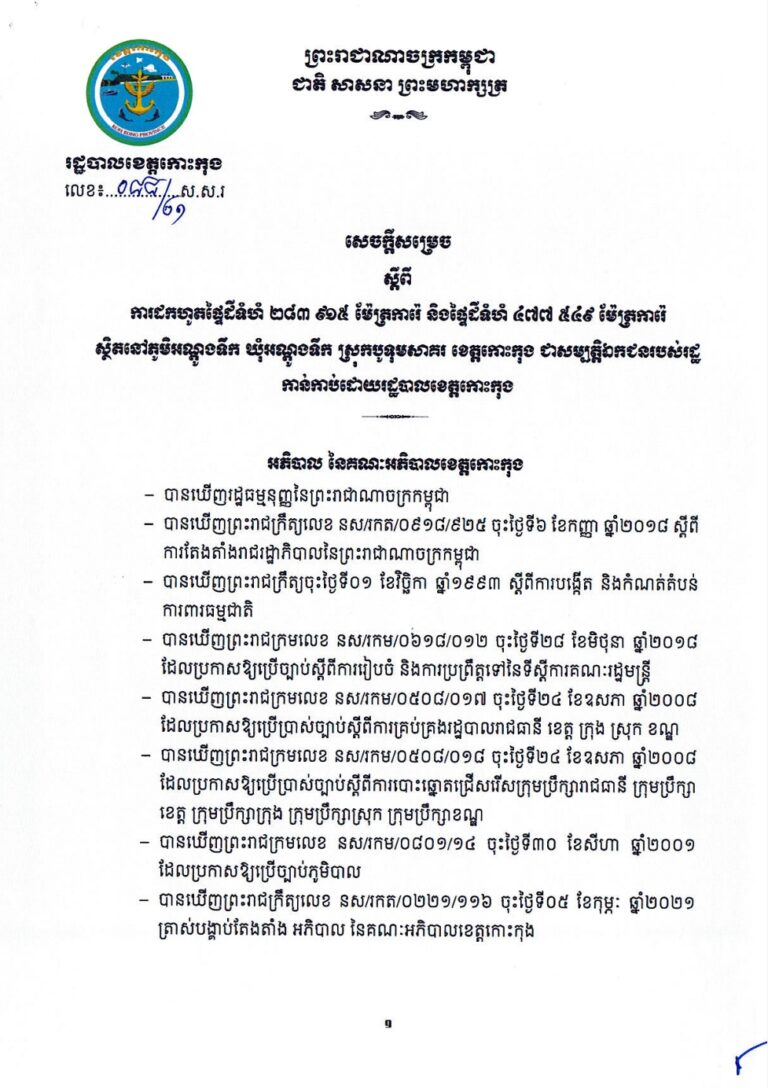 សេចក្តីសម្រេច ស្តីពីការដកហូតផ្ទៃដីទំហំ ២៨៣៩១៥ម៉ែត្រការ៉េ និងផ្ទៃដីទំហំ ៤៧៧៥៤៩ម៉ែត្រការ៉េ ស្ថិតនៅភូមិអណ្តូងទឹក ឃុំអណ្តូងទឹក ស្រុកបូទុមសាគរ ខេត្តកោះកុង ជាសម្បត្តិឯកជនរបស់រដ្ឋកាន់កាប់ដោយរដ្ឋបាលខេត្តកោះកុង
