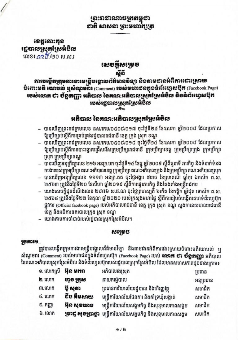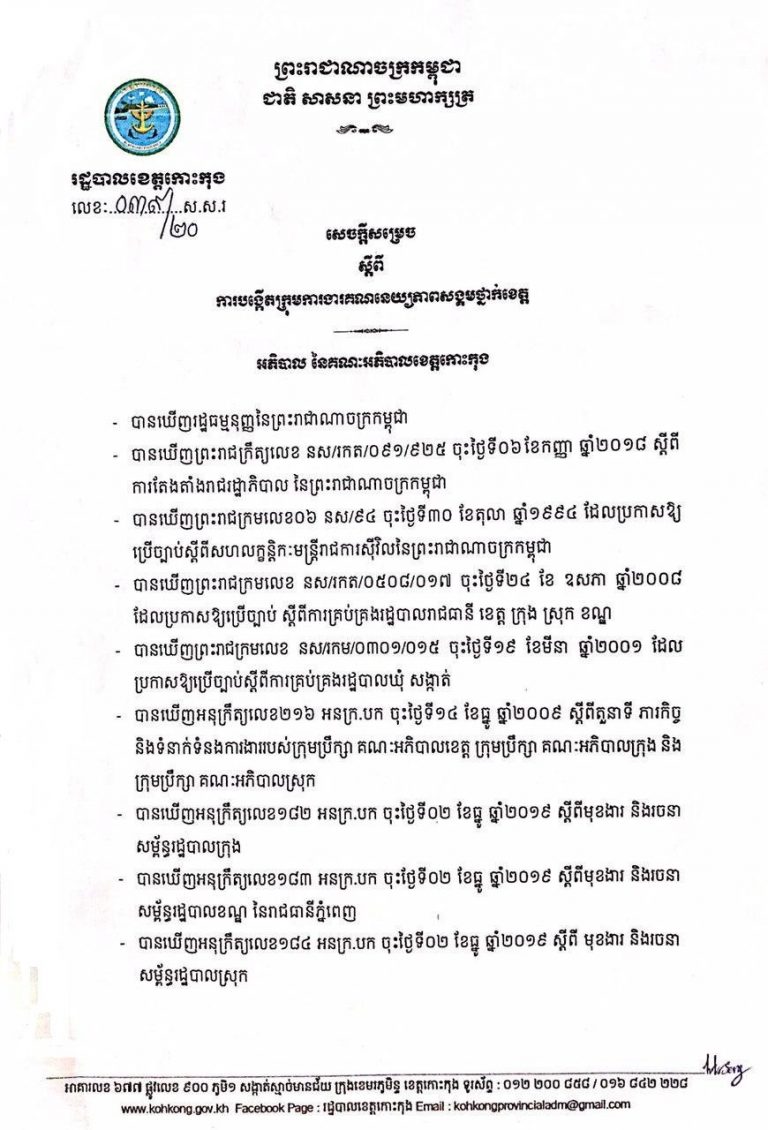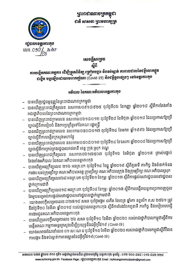 សេចក្តីសម្រេច ស្តីពីការបង្កើតគណៈកម្មការ ដើម្បីត្រួតពិនិត្យ ត្រៀមបង្ការ និងទប់ស្កាត់ ការរាលដាល នៃជម្ងឺរលាកផ្លូវដង្ហើម បង្កឡើងដោយមេរោគកូរ៉ូណា (Covid-19) និងជម្ងឺឆ្លងផ្សេងៗ នៅខេត្តកោះកុង
