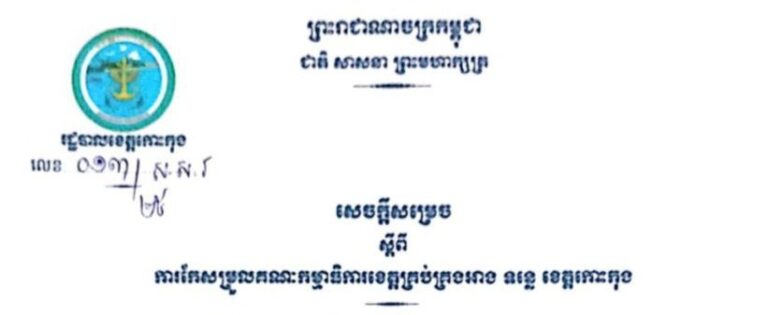 សេចក្តីសម្រេច ស្តីពីការកែសម្រួលគណៈកម្មាធិការខេត្តគ្រប់គ្រងអាង ទន្លេ ខេត្តកោះកុង