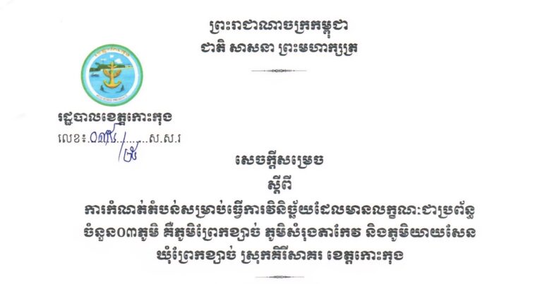 សេចក្តីសម្រេច ស្តីពីការកំណត់តំបន់សម្រាប់ធ្វើការវិនិច្ឆ័យដែលមានលក្ខណៈជាប្រព័ន្ធ ចំនួន០៣ភូមិ គឺភូមិព្រែកខ្សាច់ ភូមិសំរុងតាកែវ និងភូមិយាយសែន ឃុំព្រែកខ្សាច់ ស្រុកគិរីសាគរ ខេត្តកោះកុង