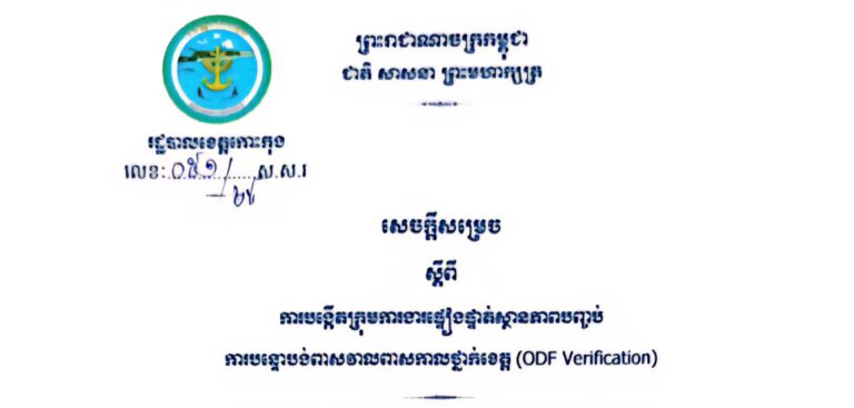 សេចក្តីសម្រេច ស្តីពីការបង្កើតក្រុមការងារផ្ទៀងផ្ទាត់ស្ថានភាពបញ្ចប់ការបន្ទោបង់ពាសវាលពាសកាលថ្នាក់ខេត្ត (ODF Verification)