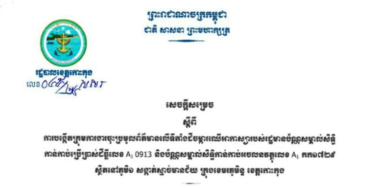 សេចក្តីសម្រេច ស្តីពីការបង្កើតក្រុមការងារចុះប្រមូលព័ត៌មានលើទីតាំងដីចម្ការឈើអាកាស្យារបស់រដ្ឋមានប័ណ្ណសម្គាល់សិទ្ធិ កាន់កាប់ប្រើប្រាស់ដីធ្លីលេខ A₁ 0913 និងប័ណ្ណសម្គាល់សិទ្ធិកាន់កាប់អចលនវត្ថុលេខ A, កក១៧២៩ ស្ថិតនៅភូមិ១ សង្កាត់ស្មាច់មានជ័យ ក្រុងខេមរភូមិន្ទ ខេត្តកោះកុង