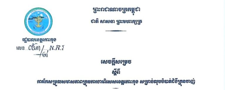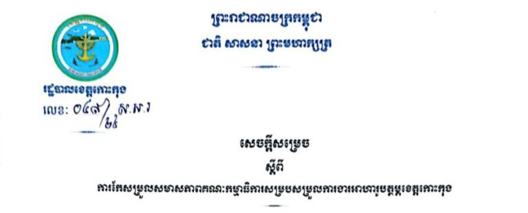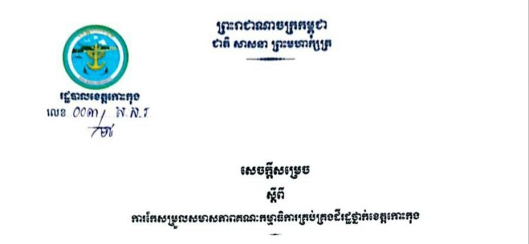 សេចក្តីសម្រេច ស្តីពីការកែសម្រួលសមាសភាពគណៈកម្មាធិការគ្រប់គ្រងដីរដ្ឋថ្នាក់ខេត្តកោះកុង