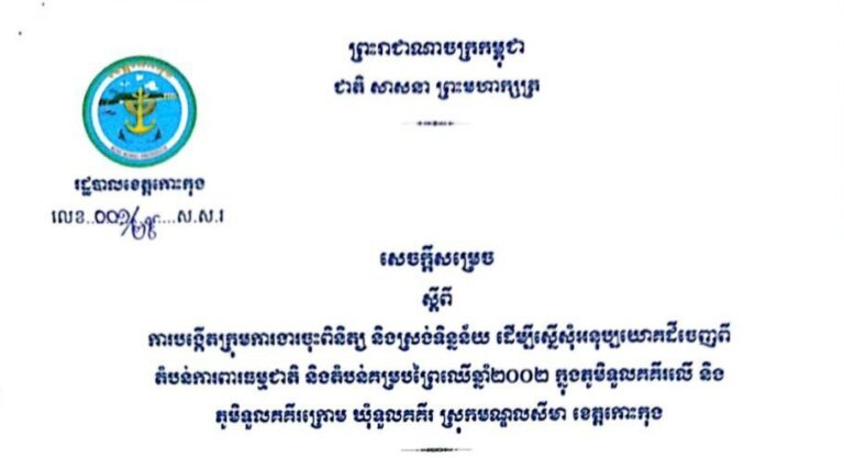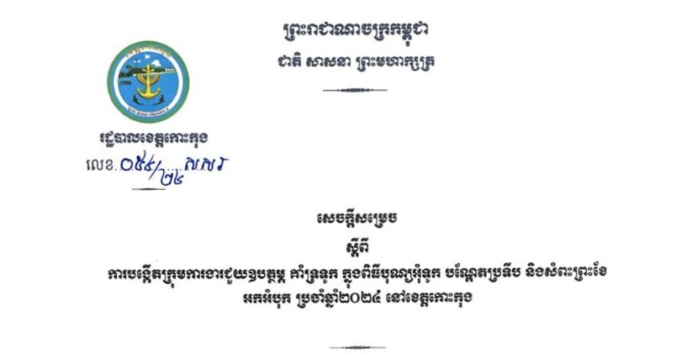 សេចក្តីសម្រេច ស្តីពីការបង្កើតក្រុមការងារជួយឧបត្ថម្ភ គាំទ្រទូក ក្នុងពិធីបុណ្យអុំទូក បណ្តែតប្រទីប និងសំពះព្រះខែ អកអំបុក ប្រចាំឆ្នាំ២០២៤ នៅខេត្តកោះកុង