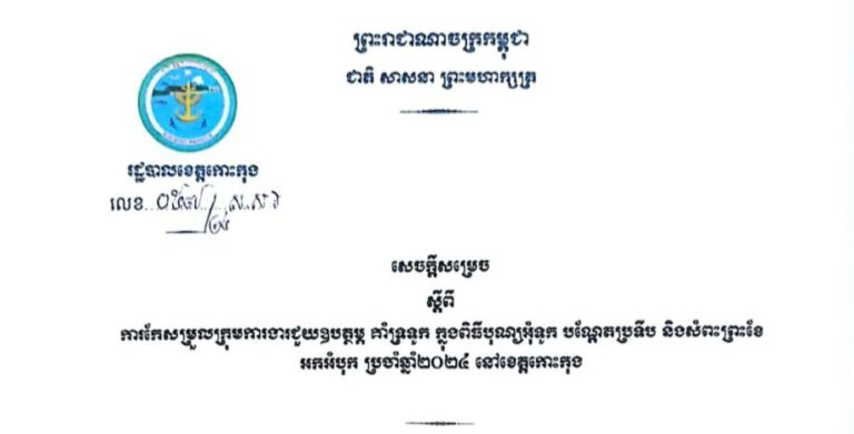 សេចក្តីសម្រេច ស្តីពីការកែសម្រួលក្រុមការងារជួយឧបត្ថម្ភ គាំទ្រទូក ក្នុងពិធីបុណ្យអុំទូក បណ្តែតប្រទីប និងសំពះព្រះខែ អកអំបុក ប្រចាំឆ្នាំ២០២៤ នៅខេត្តកោះកុង
