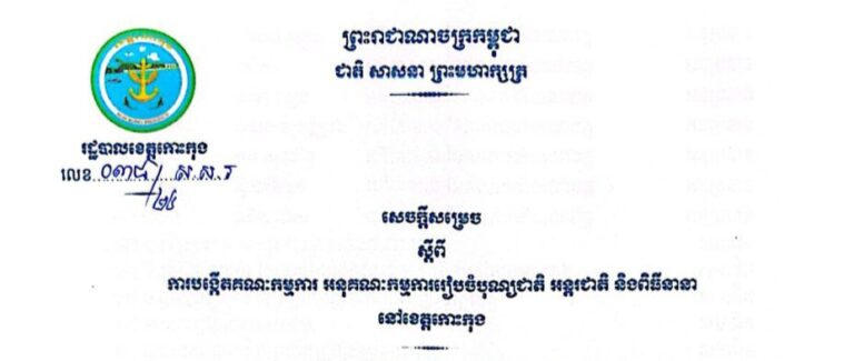 សេចក្តីសម្រេច ស្តីពីការបង្កើតគណៈកម្មការ អនុគណៈកម្មការរៀបចំបុណ្យជាតិ អន្តរជាតិ និងពិធីនានា នៅខេត្តកោះកុង