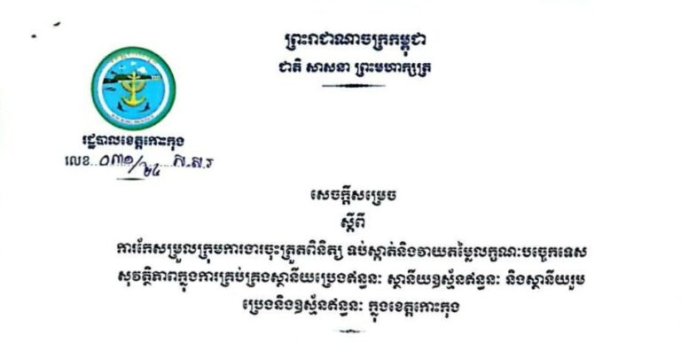 ដីកា ស្តីពីការកែសម្រួលសមាសភាពគណៈកម្មការវាយតម្លៃអង្គភាពផ្តល់សេវាធារណៈ សម្រាប់ខេត្តកោះកុង ក្នុងវិស័យអប់រំ និងវិស័យសុខាភិបាល
