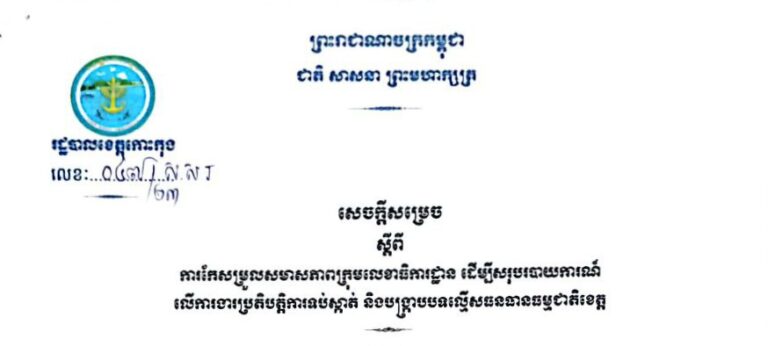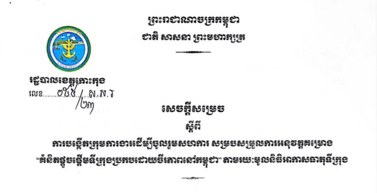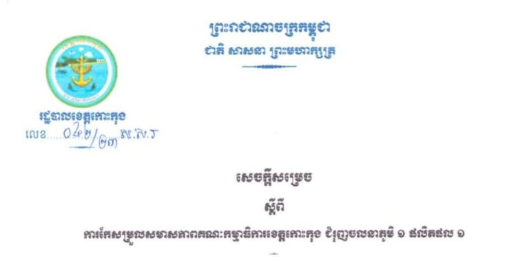 សេចក្តីសម្រេច ស្តីពីការកែសម្រួលសមាសភាពគណៈកម្មាធិការខេត្តកោះកុង ជំរុញចលនាភូមិ ១ ផលិតផល ១