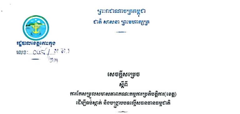 សេចក្តីសម្រេច ស្តីពីការកែសម្រួលសមាសភាពគណៈកម្មាធិការគ្រប់គ្រងដីរដ្ឋថ្នាក់ខេត្តកោះកុង
