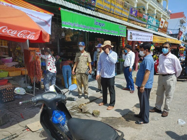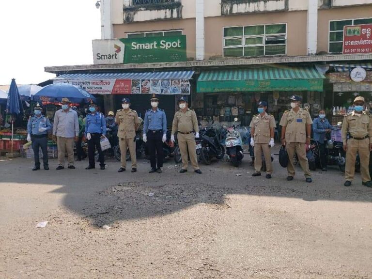គណៈបញ្ជាការឯកភាពរដ្ឋបាលក្រុងខេមរភូមិន្ទ បានចុះរៀបចំសណ្ដាប់ធ្នាប់និងផ្សព្វផ្សាយពីវិធានការទប់ស្កាត់និងបង្កាជំងឺកូវីដ-19 នៅជុំវិញផ្សារដងទង់