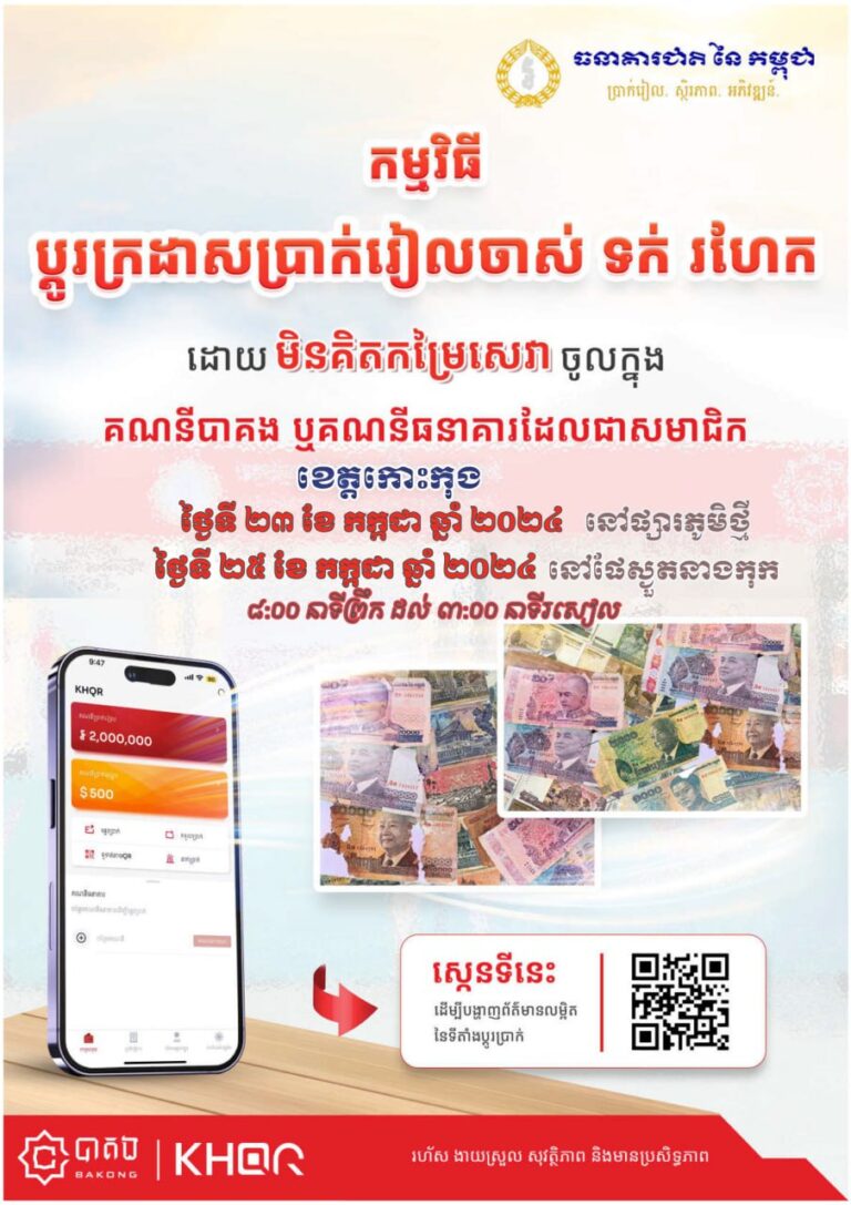 សាខាធនាគារជាតិនៃកម្ពុជា ខេត្តកោះកុង មានកិត្តិយសសូមជម្រាបជូនដល់សាធារណជននៅខេត្តកោះកុង ទាំងអស់ឱ្យបានជ្រាបថា ដើម្បីជំរុញ និងលើកកម្ពស់ការប្រើប្រាស់ប្រព័ន្ធទូទាត់ឌីជីថល KHQR និងបាគង ក៏ដូចជា គាំទ្រគោលនយោបាយលើកកម្ពស់ការប្រើប្រាស់ប្រាក់រៀល សាខាធនាគារជាតិនៃកម្ពុជា ខេត្តកោះកុង នឹងចុះធ្វើការប្តូរ ក្រដាស់ប្រាក់រៀលចាស់ ទក់ និងរហែក ជូនសាធារណជនតាមរយៈការផ្ទេរប្រាក់ចូលគណនីតាមប្រព័ន្ធឌីជីថល KHQR ចំនួន២ថ្ងៃ នៅថ្ងៃទី ០៦ ខែ សីហា ឆ្នាំ ២០២៤ ទីតាំងនៅខាងមុខវិទ្យាស្ថានពហុបច្ចេកទេសខេត្តកោះកុង និងថ្ងៃទី ០៨ ខែ សីហា ឆ្នាំ ២០២៤ នៅផ្សារភូមិ ៤ ដងទង់ វេលាម៉ោង ៨:០០ នាទីព្រឹក ដល់ម៉ោង ៣:០០ នាទីរសៀល សាធារណជនអាចអញ្ជើញមកប្តូរក្រដាស់ប្រាក់រៀលចាស់ ទក់ និងរហែក ដោយមិនគិតកម្រៃសេវា