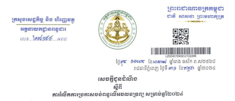 សេចក្តីជូនដំណឹង ស្តីពី ការរំលឹកការប្រកាសបង់ពន្ធលើអចលនទ្រព្យ សម្រាប់ឆ្នាំ២០២៤