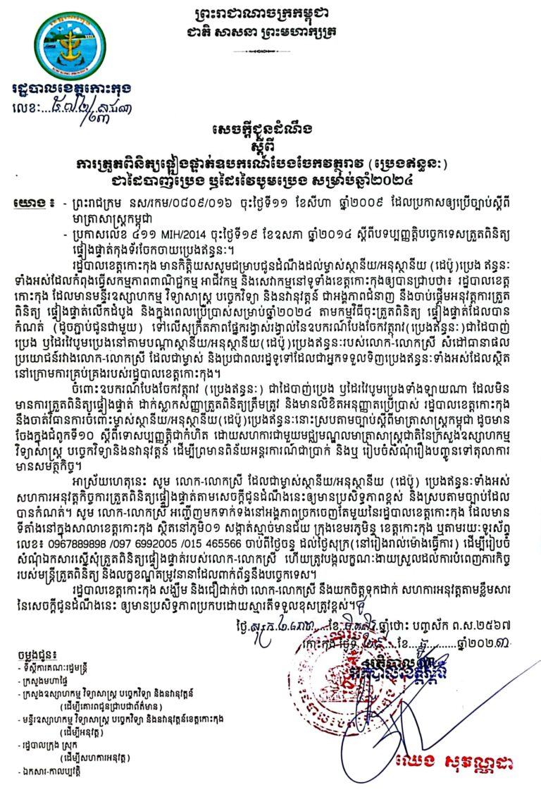 សេចក្តីជូនដំណឹងស្តីពីការត្រួតពិនិត្យផ្ទៀងផ្ទាត់ឧបករណ៍បែងចែកវត្ថុរាវ (ប្រេងឥន្ធនៈ)ជាដៃបាញ់ប្រេង ឬដៃរវៃបូមប្រេង សម្រាប់ឆ្នាំ២០២៤។