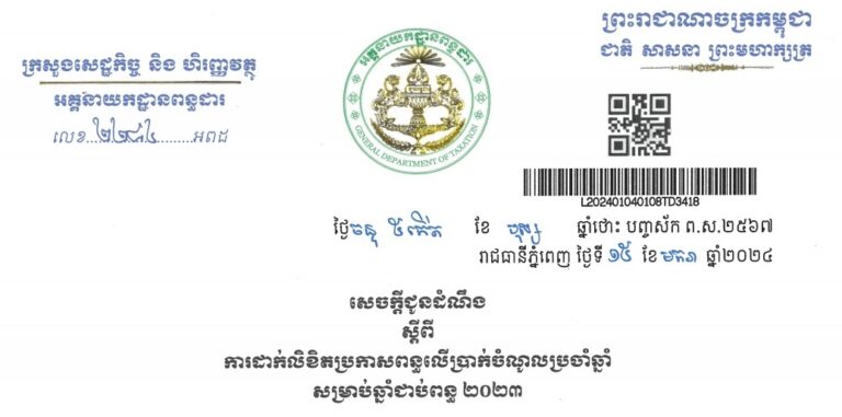 សេចក្ដីជូនដំណឹង ស្ដីពី ការដាក់លិខិតប្រកាសពន្ធលើប្រាក់ចំណូលប្រចាំឆ្នាំ សម្រាប់ឆ្នាំជាប់ពន្ធ ២០២៣