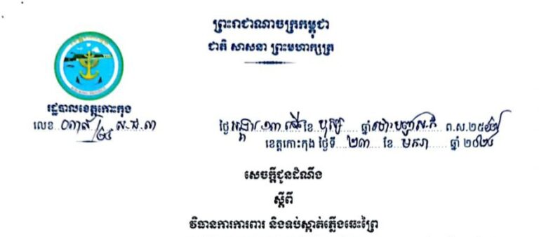 លិខិតអំពាវនាវ របស់រដ្ឋបាលខេត្តកោះកុង
