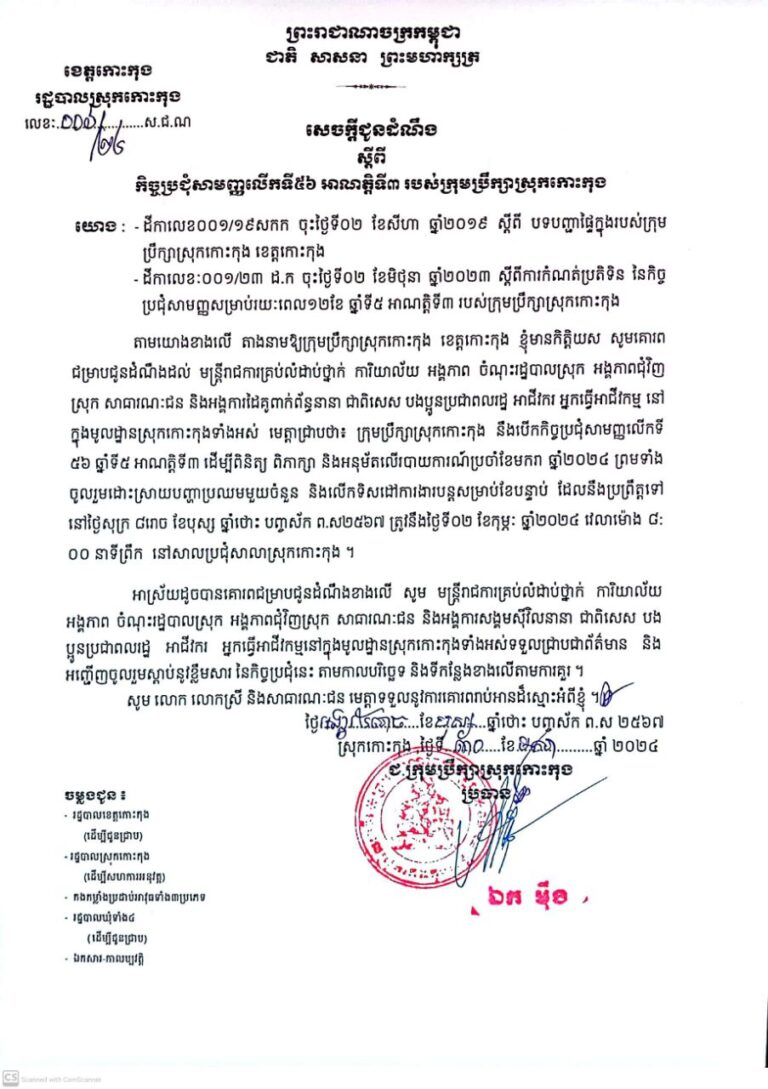 សេចក្ដីជូនដំណឹង ស្តីពីកិច្ចប្រជុំសាមញ្ញលេីកទី៥៦ អាណត្តិទី៣ របស់ក្រុមប្រឹក្សាស្រុកកោះកុង