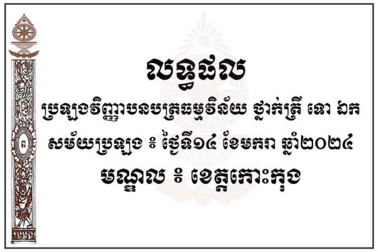 លទ្ធផលប្រឡងវិញ្ញាបនបត្រធម្មវិន័យ ត្រី ទោ ឯក សម័យប្រឡង ថ្ងៃទី១៤ ខែមករា ឆ្នាំ២០២៤ មណ្ឌល ខេត្តកោះកុង