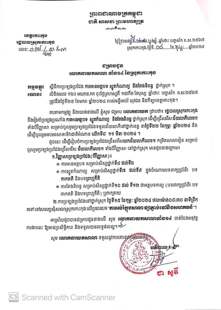 សេចក្តីជូនដំណឹង ស្តីពីការប្រឡងប្រជែង ការអានអត្ថបទ ស្មូតកំណាព្យ និងតែងនិពន្ធ ថ្នាក់ស្រុក របស់រដ្ឋបាលស្រុកកោះកុង