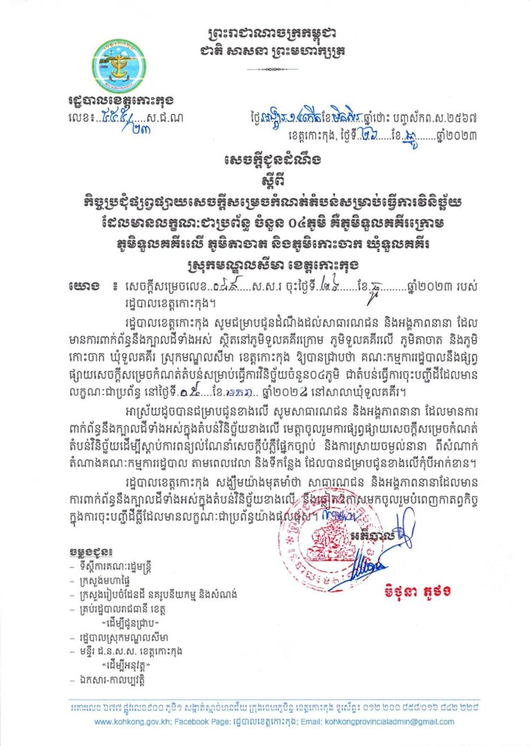 សេចក្តីជូនដំណឹង ស្តីពីកិច្ចប្រជុំផ្សព្វផ្សាយសេចក្តីសម្រេចកំណត់តំបន់សម្រាប់ធ្វើការវិនិច្ឆ័យ ដែលមានលក្ខណៈជាប្រព័ន្ធ ចំនួន ០៤ភូមិ គឺភូមិទួលគគីរក្រោម ភូមិទួលគគីរលើ ភូមិតាចាត និងភូមិកោះចាក ឃុំទួលគគីរ ស្រុកមណ្ឌលសីមា ខេត្តកោះកុង