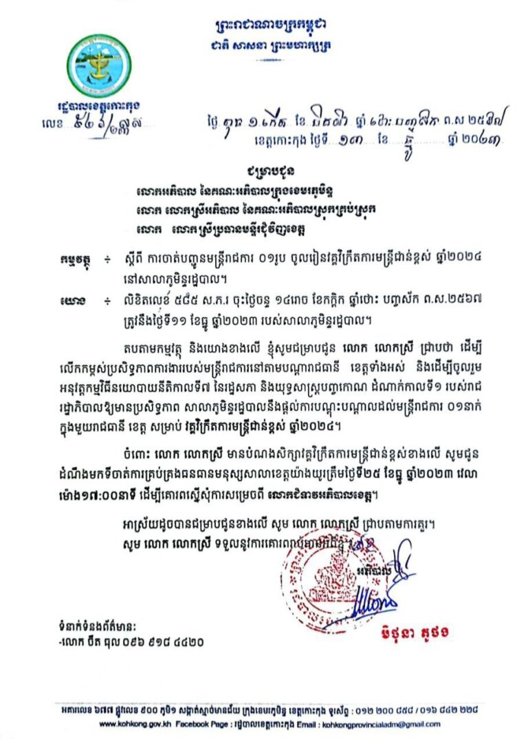 សេចក្តីជូនដំណឹង ស្តីពីការចាត់បញ្ចូនមន្ត្រីរាជការ ០១រូប ចូលរៀនវគ្គវិក្រឹតការមន្ត្រីជាន់ខ្ពស់ ឆ្នាំ២០២៤ នៅសាលាភូមិន្ទរដ្ឋបាល