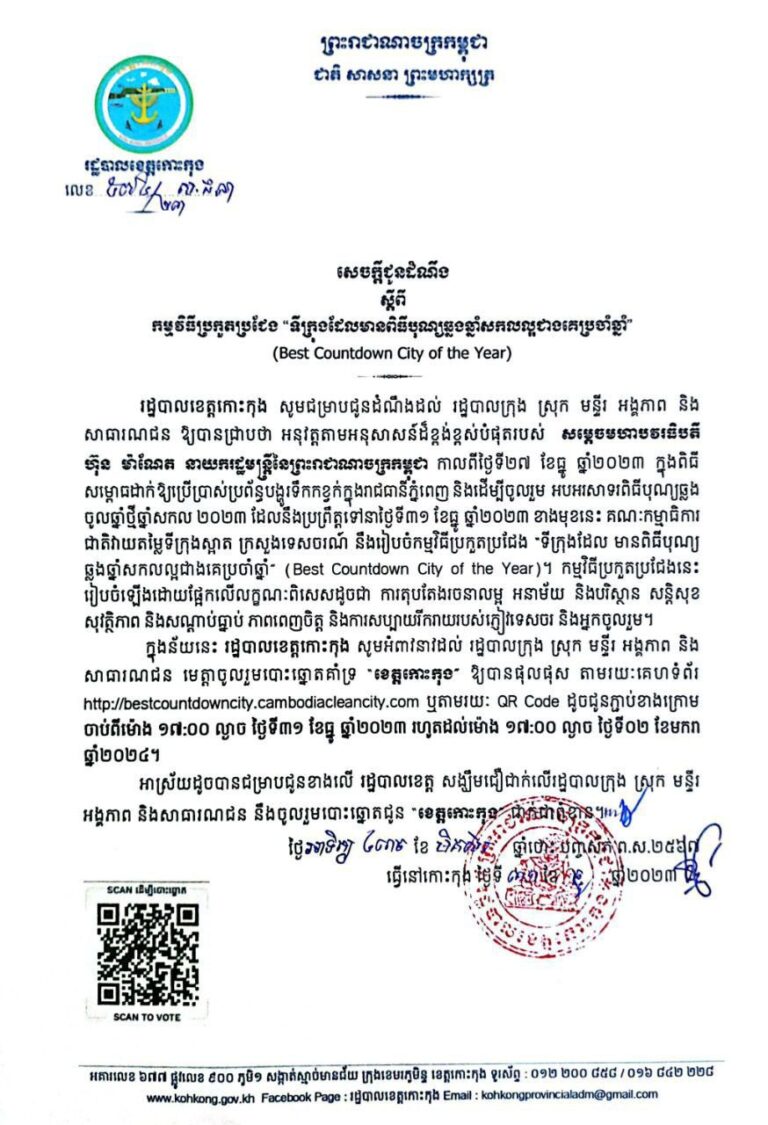 សេចក្តីជូនដំណឹង ស្តីពី កម្មវិធីប្រកួតប្រជែង “ទីក្រុងដែលមានពិធីបុណ្យឆ្លងឆ្នាំសកលល្អជាងគេប្រចាំឆ្នាំ”(Best Countdown City of the Year)