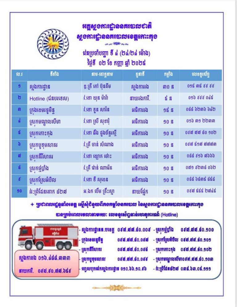 ប្រជាពលរដ្ឋ​ទូទាំង​ខេត្ត​ ស្នេីសូមជំនួយ​ពី​ កងកម្លាំង​នគរបាល​ នៃ​ស្នងការដ្ឋាន​នគរបាល​ខេត្ត​កោះកុង​ បាន​គ្រប់​ពេល​វេលា​ តាមរយៈលេខទូរសព្ទ​ទាន់​ហេតុការណ៍​ (Hoteline)