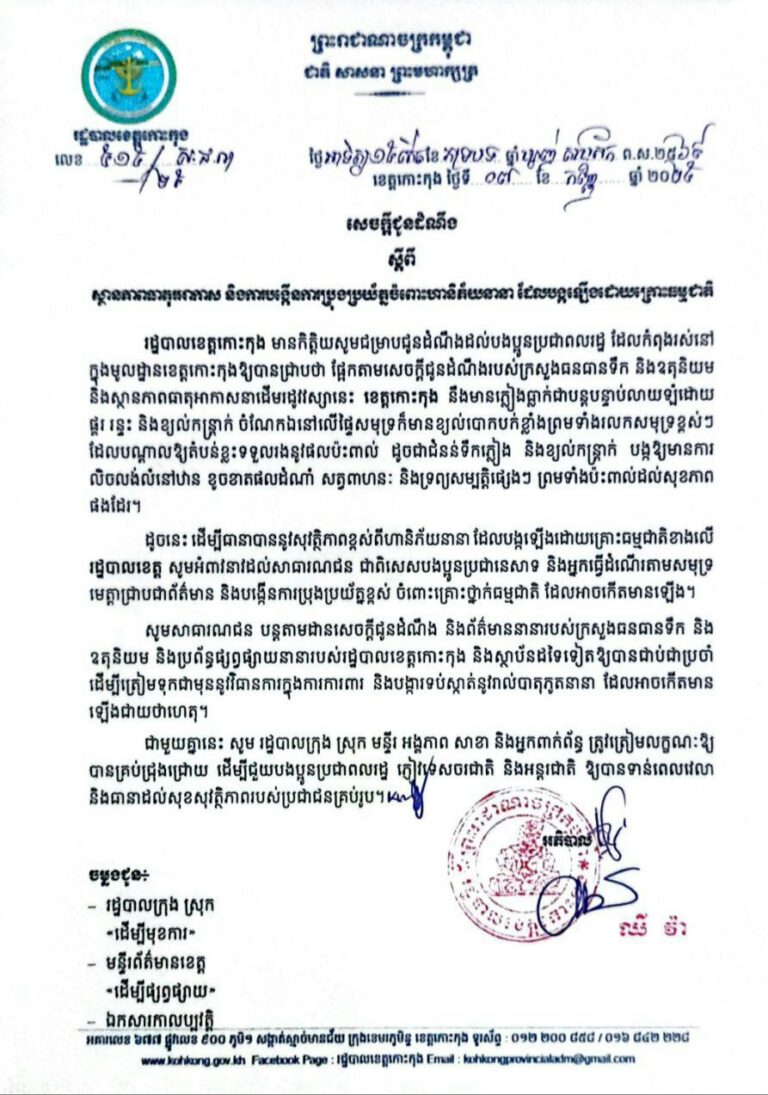 សេចក្តីជូនដំណឹង ស្តីពីស្ថានភាពធាតុរអាកាស និងការបង្កើនការប្រុងប្រយ័ត្នចំពោះហានិភ័យនានា ដែលបង្កឡើងដោយគ្រោះធម្មជាតិ