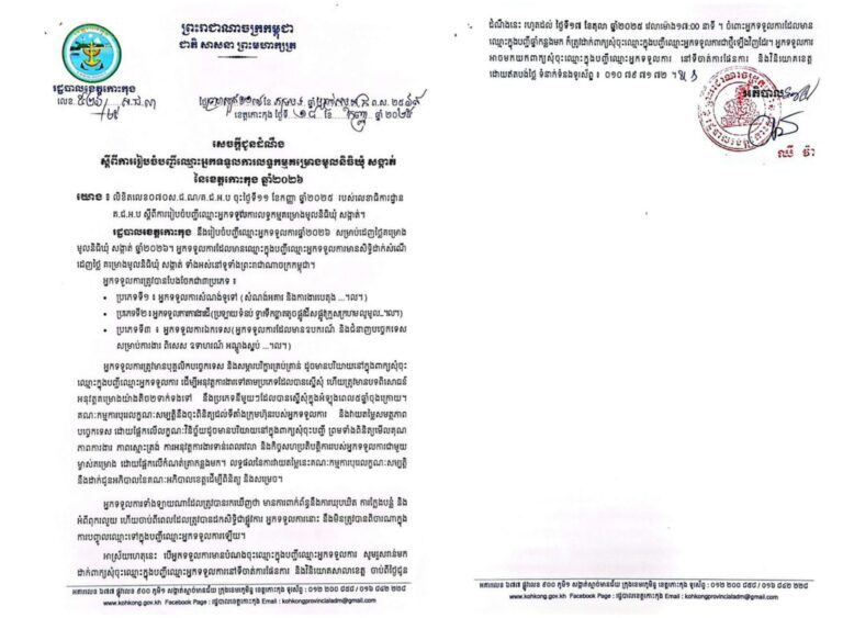 សេចក្តីជូនដំណឹង ស្ដីពីការរៀបចំបញ្ជីឈ្មោះអ្នកទទួលការលទ្ធកម្មគម្រោងមូលនិធិឃុំ សង្កាត់ នៃខេត្តកោះកុង ឆ្នាំ២០២៦