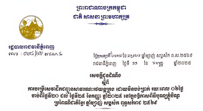 សេចក្តីជូនដំណឹង ស្តីពីការបម្រើសេវាដឹកជញ្ជូនសាធារណៈរថយន្តក្រុង ដោយមិនបង់ប្រាក់ រយៈពេល ៦ថ្ងៃ ចាប់ពីថ្ងៃទី២០ ដល់ ថ្ងៃទី២៥ ខែកញ្ញា ឆ្នាំ២០២៥ នៅក្នុងឱកាសពិធីបុណ្យភ្ជុំបិណ្ឌ ប្រពៃណីជាតិខ្មែរ ឆ្នាំម្សាញ់ សប្តស័ក ពុទ្ធសករាជ ២៥៦៩